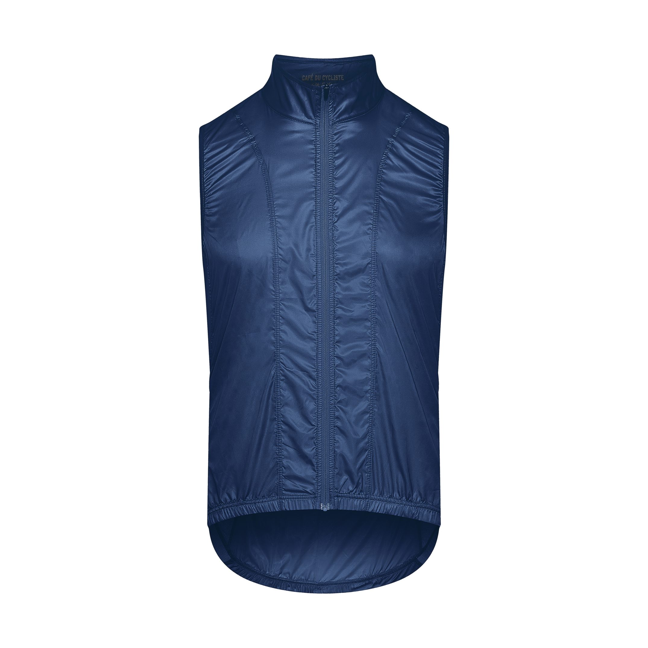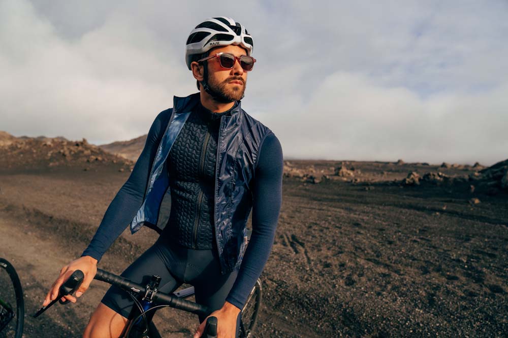 The race cut cycling vest has a full zip, an elastic gripper at the waist for added stability and an opening for easy access to jersey pockets.