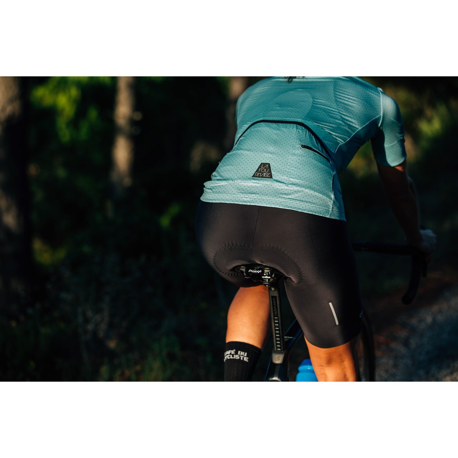 Along with a full zip to give maximum airflow when needed, there are three reinforced cargo pockets, including a zipped valuables pocket. Signature elements include Café du Cycliste logotype on the chest and a LA FOURNAISE badge at the rear. A reflective tab adds visibility when the light fades.