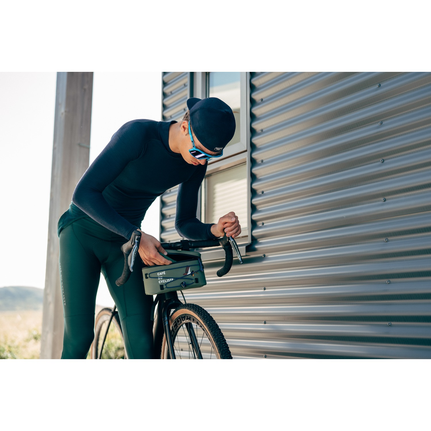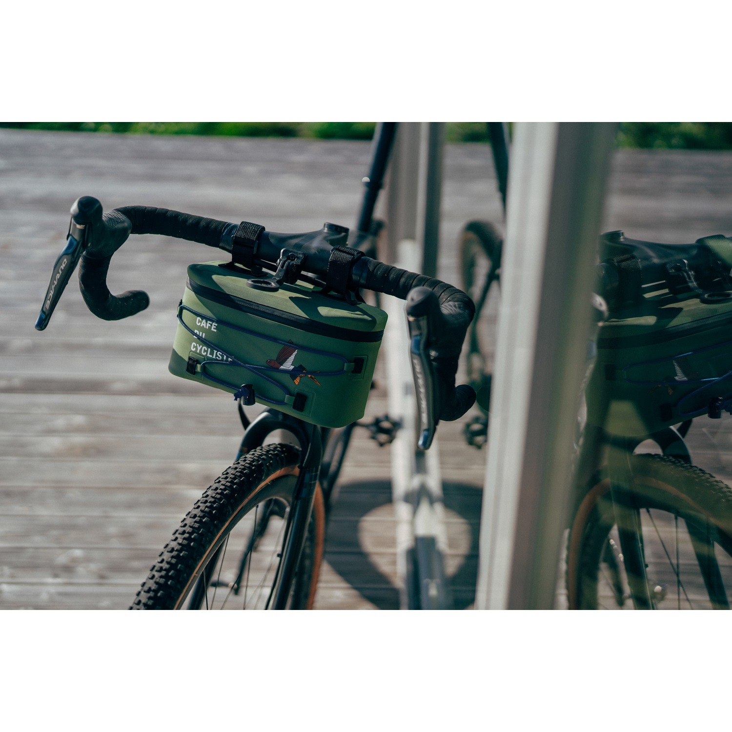 Featuring the Café du Cycliste flying fish badge and available in two colours, the bar bag is ideal for extending adventures by hours, into days and beyond.