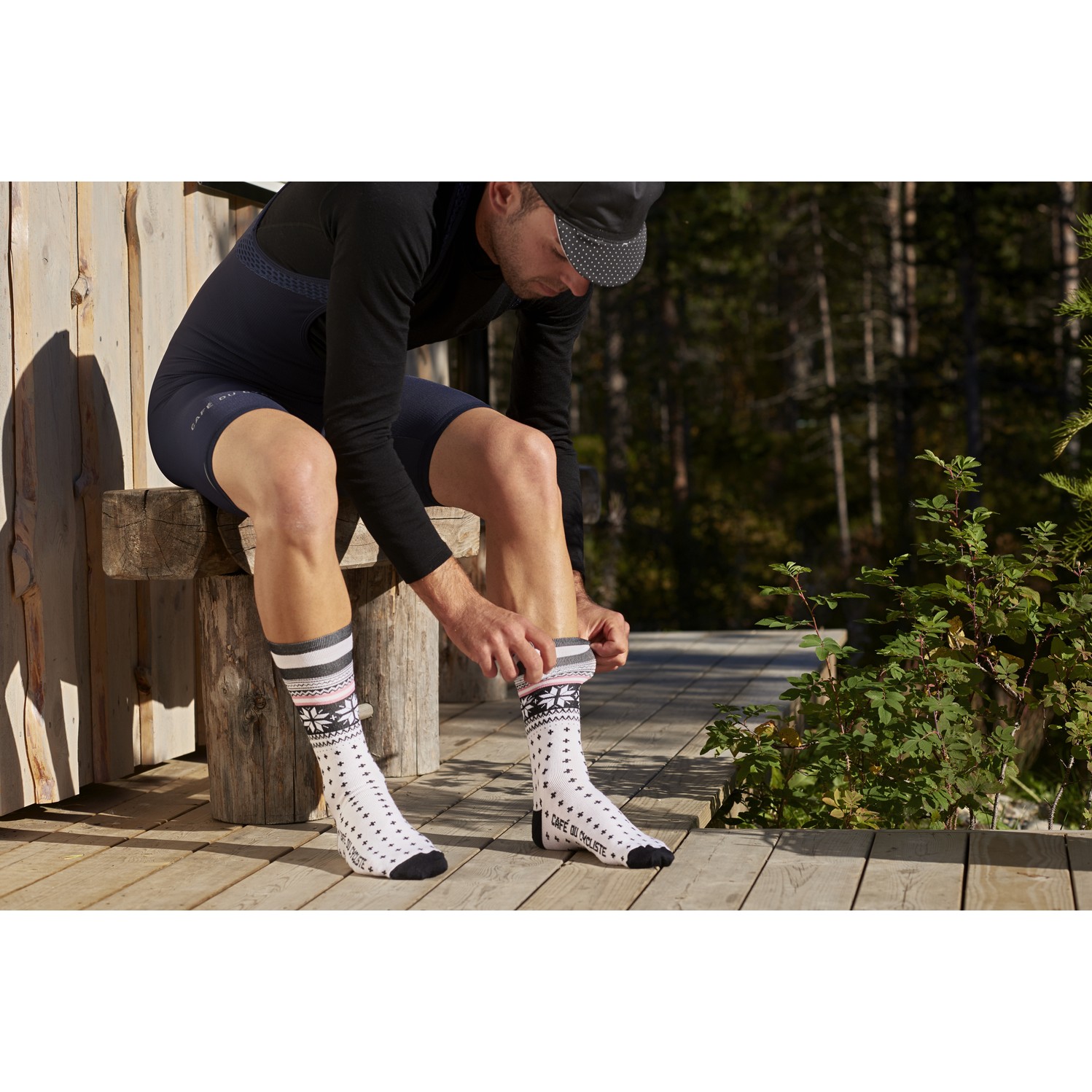 Ces chaussettes hautes sont stylisées avec les détails uniques du Café du Cycliste et sont fabriquées en Italie.