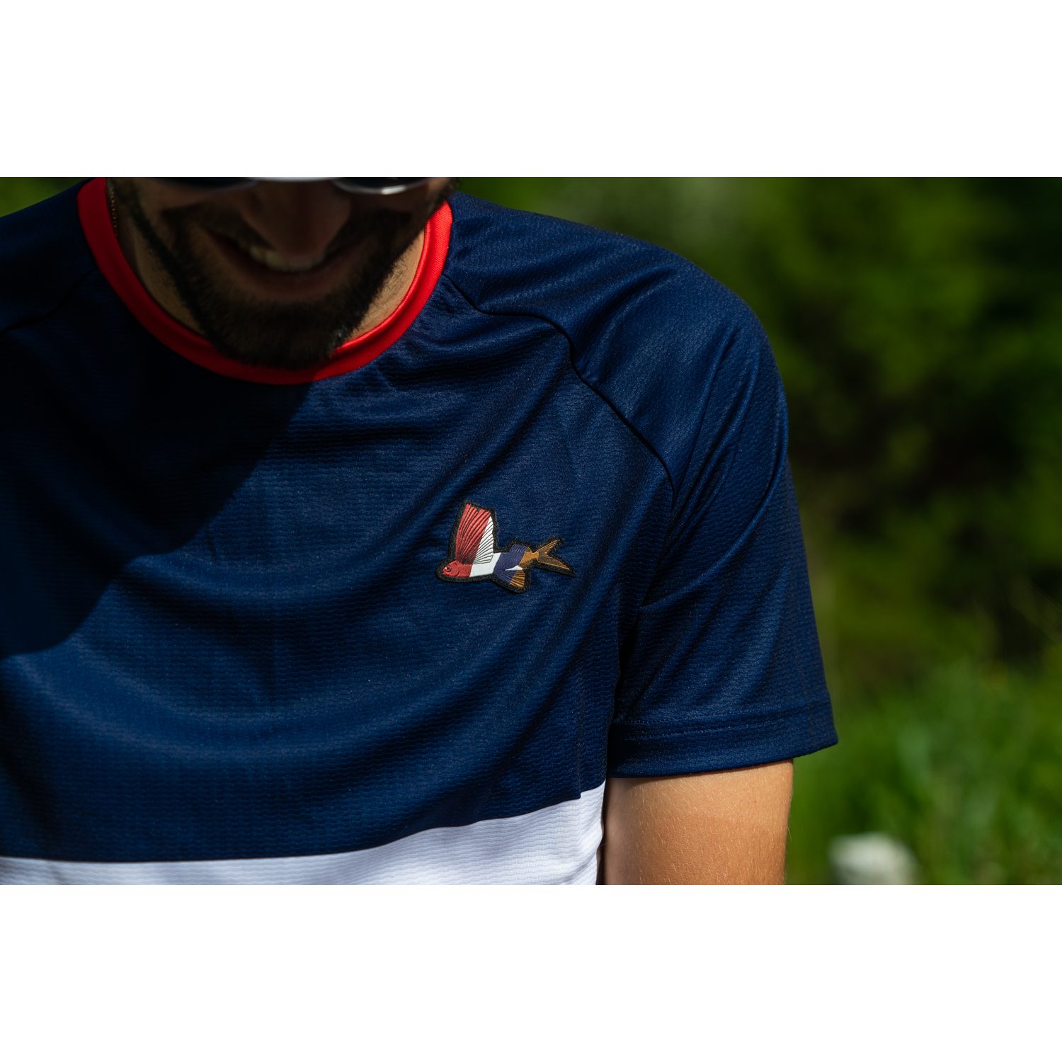 Le maillot a une structure de poche renforcée avec trois poches cargo et les couleurs signatures bleu, blanc, rouge.